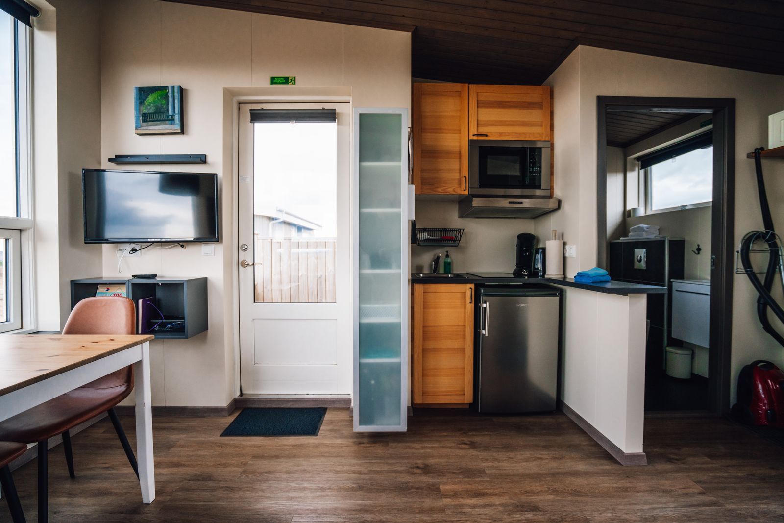 The kitchen offers dishwashing soap, a sponge, a kettle, a toaster, a microwave, a stovetop, and a refrigerator. A coffee machine with coffee and tea is also provided, along with essential cooking supplies such as pots, pans, crockery, cutlery, salt, pepper, sugar, and oil. The private bathroom features a shower, hairdryer, towels, and soap. Free parking is available directly in front of the cabin. Please note that pets are not allowed.